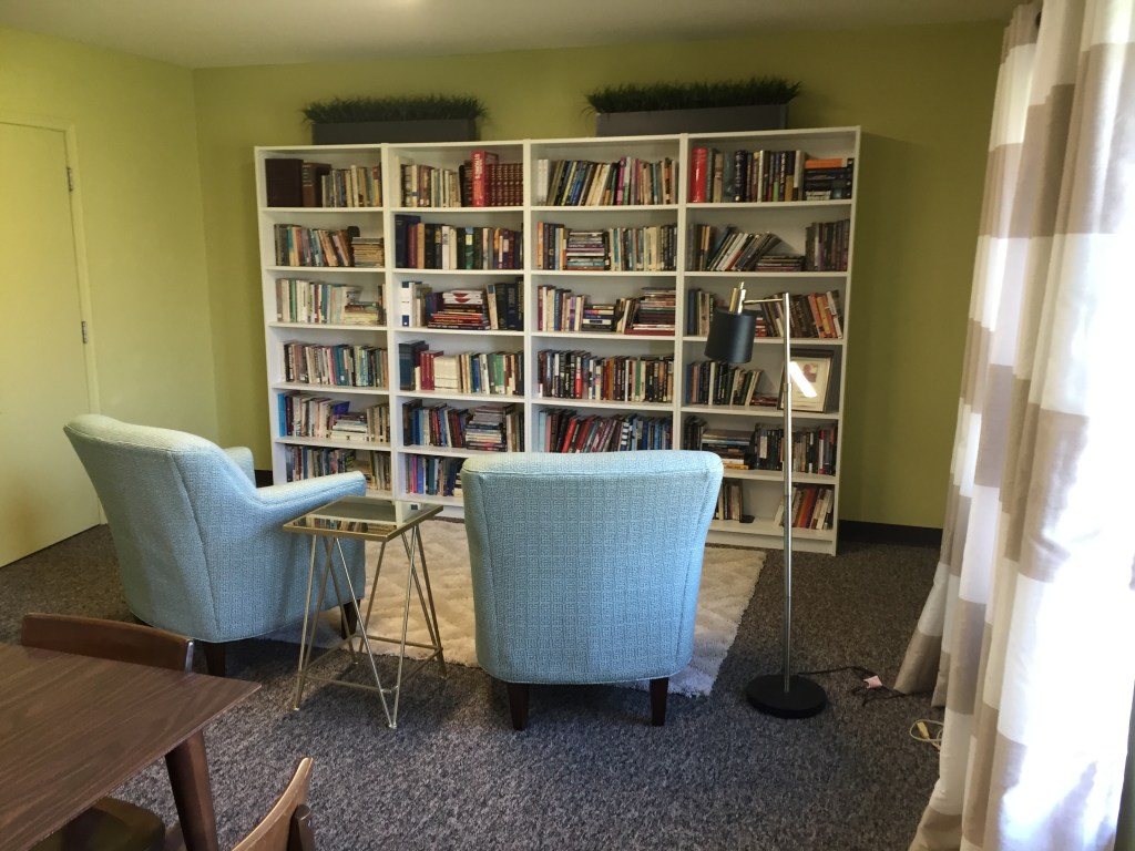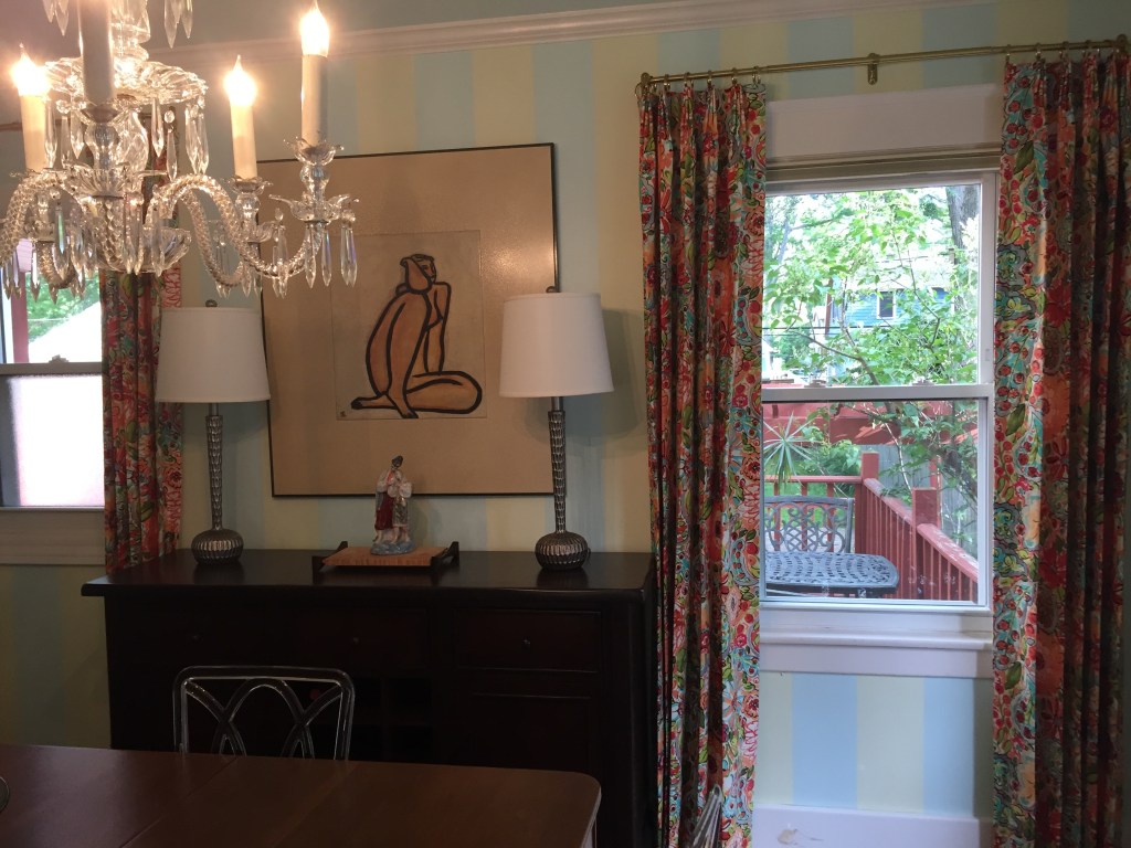 This client loves color and funk. I paired acrylic dining chairs with an antique table and added “I Dream of Jeannie” buffet lamps along with colorful drapery to give her exactly what she wanted.