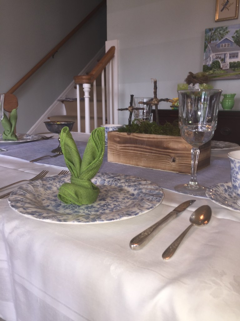 China, silver, distressed wood, and napkin bunny ears make this a delightful Easter brunch table.