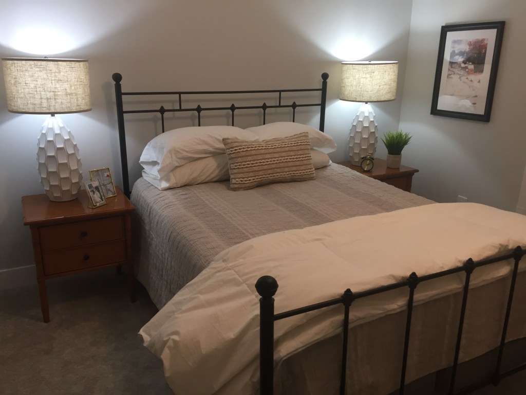 A symmetrical arrangement of bedside tables and lamps, a bed layered with beautiful neutral textiles, and a serene wall color make for a restful retreat in this guest room.