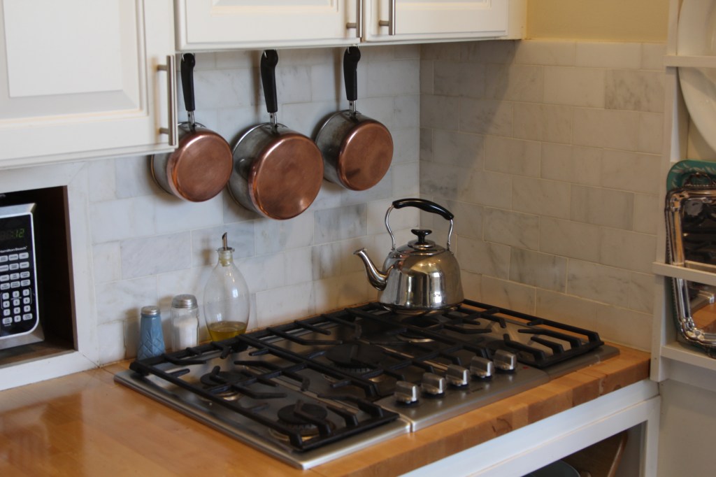 We shined up and hung the client’s 30-year-old Revere Ware and had an inexpensive platter rack made to add two special features to this kitchen.